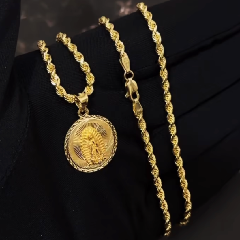 Upgrade your style with our 14K Gold Virgencita Set – a blend of elegance and faith. This special set includes a beautifully crafted Virgencita pendant made from high-quality real 14K gold. Paired with the pendant is a Real 14K 22-inch long, 3mm width semi-solid Rope chain. This classic chain complements the pendant, creating a stylish look. Wear it confidently, knowing you're getting a stylish and symbolic set that won't break the bank.