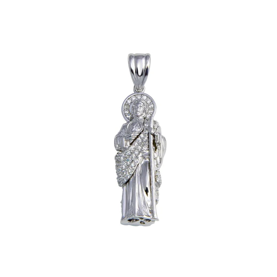 Upgrade your jewelry collection with our beautiful San Juditas Pendant. This pendant is expertly crafted from high-quality Italian silver and adorned with top-notch CZ stones that sparkle brilliantly. It adds a touch of luxury to your look, resembling natural diamond pendants that cost much more. Elevate your style with this stunning statement piece today.