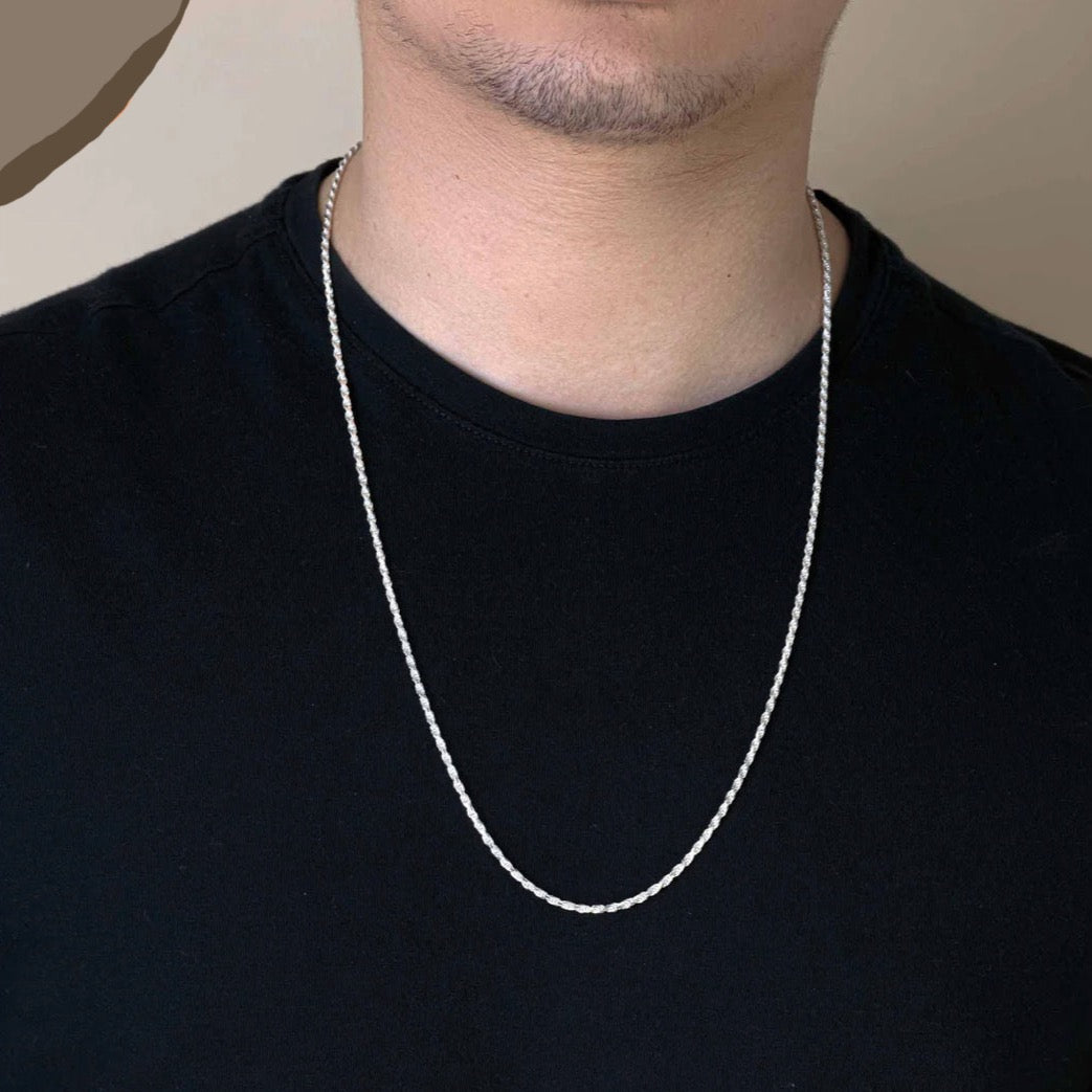 Take your style to new heights with our 925 Sterling Silver Rope Chain (2.5MM). Expertly crafted from premium Italian silver, this timeless accessory showcases a classic Rope design for an elegant touch. With a secure lobster clasp, it offers both durability and peace of mind. Elevate your look with our exquisite 925 Sterling Silver Rope Chain (2.5MM).